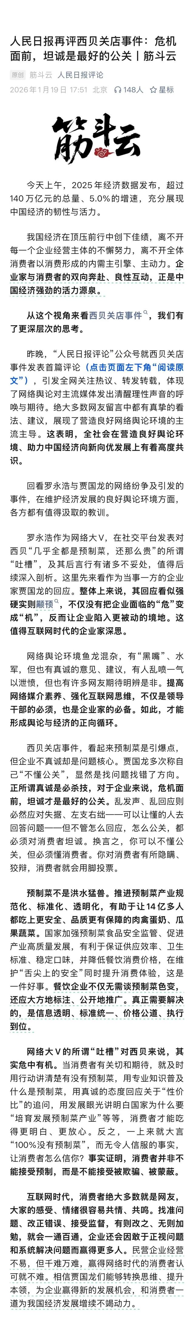 1月19日,人民日报发布评论文章《危机面前,坦诚是最好的公关》,以下为评论全文: