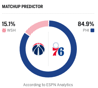 赛前,美媒ESPN预测本场比赛,奇才胜率15.1%,76人胜率84.9%。